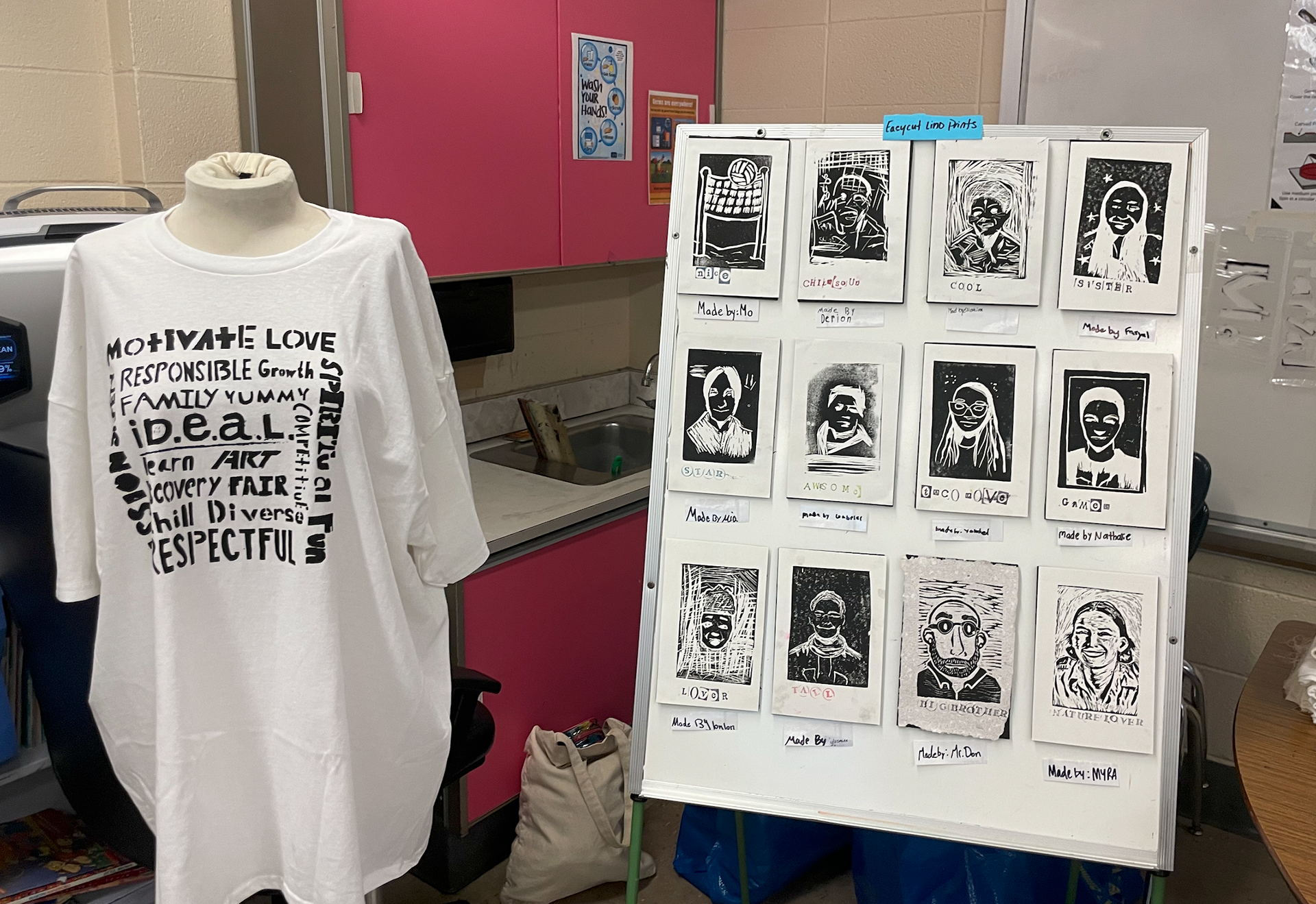 Students were partnered with someone in their group and conducted interviews with their partners in order to get to know them on a deeper level. From these interviews, students created a label for their partner that represents an aspect of who they are. Using easy-cut linoleum blocks the students carved portraits of their partners from images that they took, printed them, and added the label as a title for their final product.